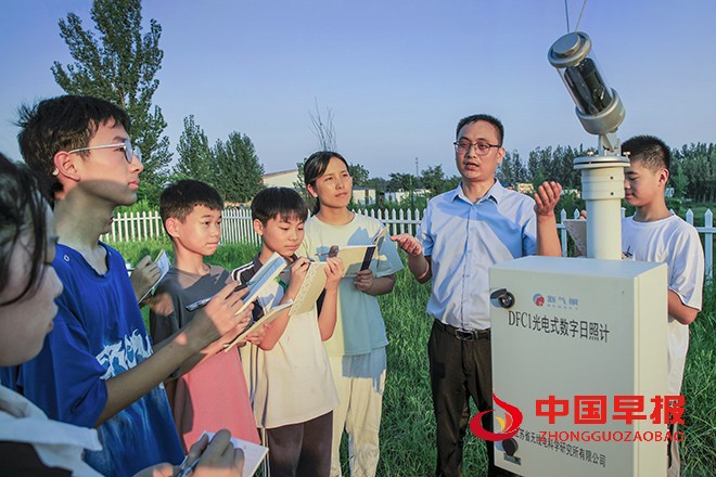 气象局工作人员正在给孩子们讲解气象观测知识。
