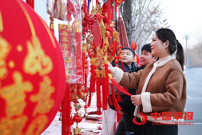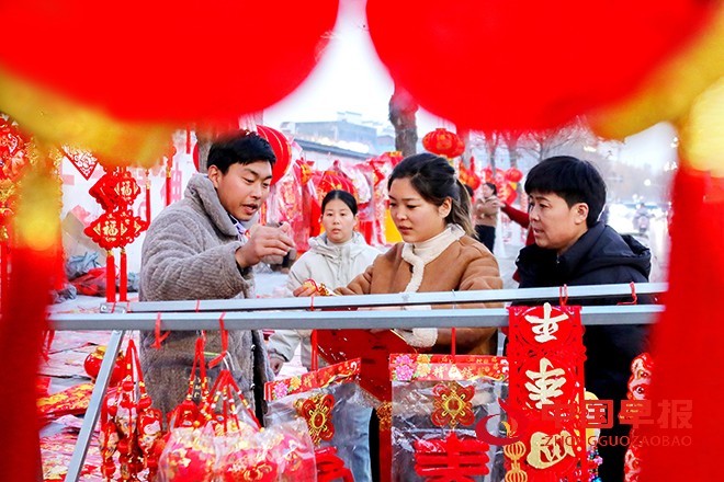 中国早报 河南讯(特约记者 李新义)1月20日,河南省开封市尉氏县滨河路年货市场,居民们在精心选购新春节庆饰品。