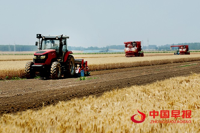 中国早报 河南讯(记者 杨琇婷)5月月26日,大型机械在尉氏县朱曲镇西街村的麦田里收割小麦并耕耙准备抢种秋作物。