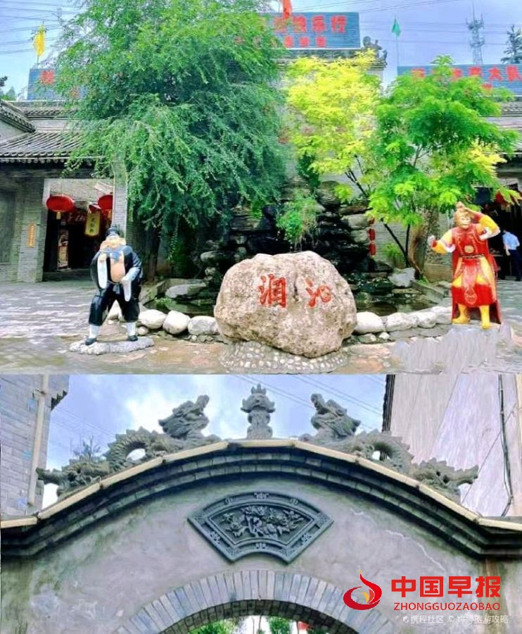 龙泉山庄文化最点睛的地方就是民俗雕塑广场。入得山庄之门,偌大的民俗雕塑广场如同一席文化盛宴等着游客分享。泉波荡漾的池塘里,两条金龙交胫戏珠,热情的迎着远方的游客。巍峨的石牌坊与百戏台遥相呼应,一道道从地泉涌出的水精灵跳起欢快的舞蹈,让民俗广场生动和鲜活。