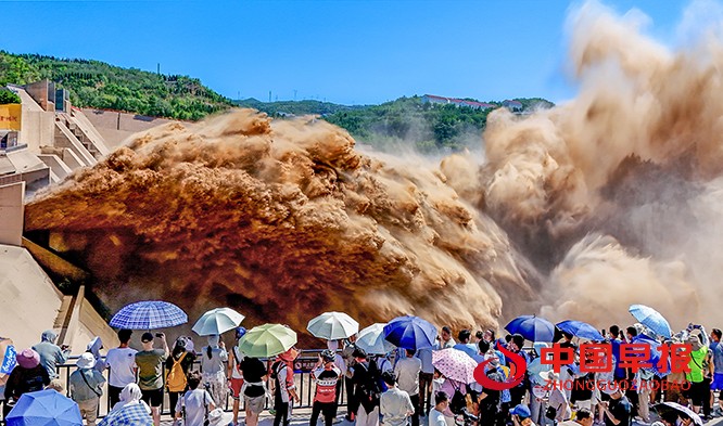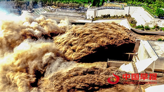 中国早报 河南讯(特约记者 李新义)7 月 6 日,河南洛阳黄河小浪底水库启动排沙作业。浑黄的河水如咆哮的黄龙从调水调沙洞奔腾涌出,上演 “黄龙出闸” 的壮观景象。