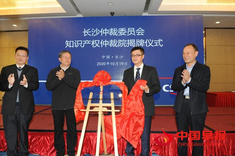 湖南省市场监督管理局党组成员、湖南省知识产权局局长段志雄,长沙仲裁委员会主任刘晓明,长沙市知识产权局党组书记、局长孙进,省司法厅公共法律服务管理处处长陈少杰共同为长沙仲裁委员会知识产权仲裁院揭牌。