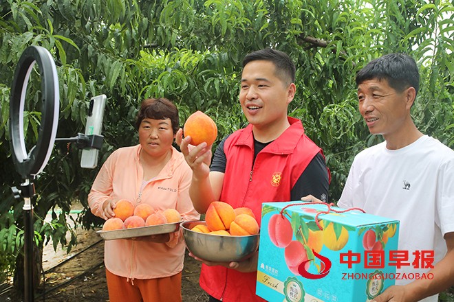 中国早报 河南讯(记者 赵玉虎 通讯员 李新义)8月8日,郑州航空港洧川镇的党员志愿者在花桥刘村的风情园特色种植产业园利用网络直播帮助果农销售销售大桃。