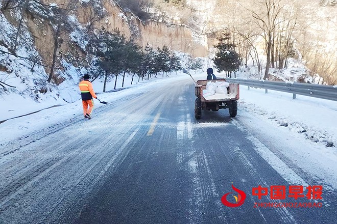 截至当日 19 时,累计出动人员 67 人次,机械 4 台次,皮卡车 2 台、农用三轮车 14 辆。工作人员争分夺秒,撒布融雪剂 57.8 吨,完成 78.2 万平方米、181 公里的扫雪除冰作业,确保所辖干线公路畅通无阻。