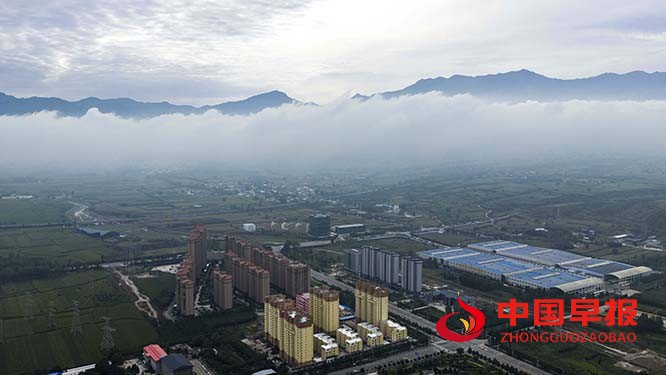 云海在山间变幻万千,时而如镜面般平静,将天空、山峦的景致清晰倒映;时而又如波涛般汹涌,在山谷间翻滚奔腾,迸发出磅礴气势。山脚下,霍州城的现代建筑群与远处的云海遥相呼应,古老自然奇景与现代城市风貌形成强烈视觉对比,令人叹为观止。