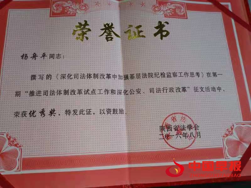 杨舟平是中国法学会会员,高级员额法官,区法学法律专家人才;中国作家协会散文家学会会员,陕西省作家协会会员,宝鸡市作家协会理事。他作为职业法官审判生涯的努力足迹和业余文学创作之路所取得的丰硕成果,印证了作家路遥的一句左右铭:“像牛一样耕耘,像黄土一样奉献!”
