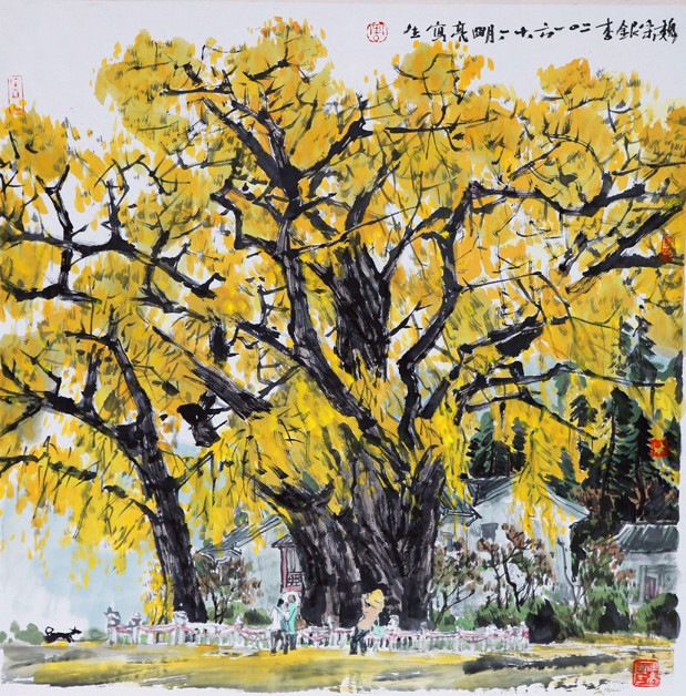 我爱她“一蓑烟雨任平生”的达观。她之所以行稳致远地走过“山陵岸谷”的沧桑,正在于她的“含辛茹苦”。无论是在穷乡僻壤的远山深坳,还是在车水马龙的喧闹都市,只要有一片土地,她就会生根吐枝,抽叶结果。也许是她遭遇人类而拥抱了整个星球吧?以致在先人的心目中,她成为“神灵”的化身。记忆中故乡镇上有一座“重阳宫”,史载是道教全真道创始人王重阳修行传道的处所。院内除了松柏苍苍外,最多的要数银杏树。秋风吹过母亲河的时候,远远望去,那一片金色黄亮黄亮,在秋阳下闪闪发光;那层层累累的白色银杏果,挂满枝头。萧瑟的秋意因为她而少了悲凉而多了融融的暖意。后来,在我漂泊异乡的日子里,听说那棵最大的银杏在一个夏日遭逢了天火的燃烧而枯萎,然而,几年后,她竟然再度萌发新的枝叶,依然把“金色”奉献给了故乡的父老。父老都说“神树”,谁也奈何不得。然而,有谁能够读懂她履历的艰难竭蹶呢?又有谁能深谙她“前身为过迹, 来世即前程”的旷朗无尘呢?