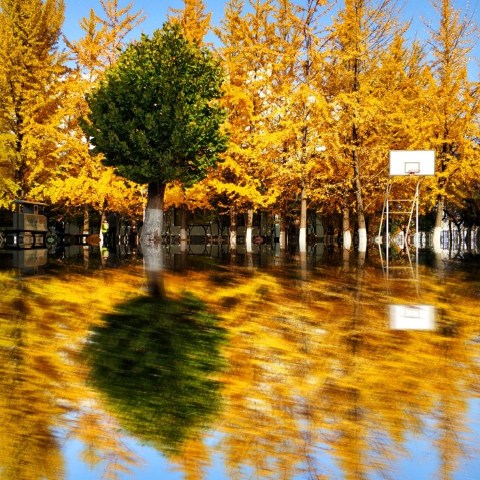 在阴雨霏霏的日子里,这“金色”就像阳光,每天温暖着我的心扉。大自然莫非也深谙交椅轮流座,三十年河东,三十年河西的道理?前多年,南方大水苍茫,暴雨成灾。而今秋,风水转到了北方,进入九月,三天一小下,五天一大下,天气预报不断传递降温的消息,新闻上不断有令人揪心的暴雨画面。书房窗户面西而开,坐在电脑前,听着秋雨淅淅沥沥地吟唱,看楼下广场终日湿漉漉地映出行道树木的倒影,整个心都是湿漉漉的,天天默念着云散天晴的祈愿。有一天,当我来开阳台的落地式窗户,眼前豁然一亮。那银杏的金色给行道投去灿灿的亮光,以致我误以为雨住天晴,阳光回归了。这种审美的错觉瞬间驱走了深秋的寒意,我的心顿时铺满了温暖。就那么静静凭栏而立,久久地望着那一片暖色,领受色彩慰藉心灵的魅力。我知道,雨依旧发泄着它的任性不羁,秋依然按部就班地走向深处,而我获得的只是一种色彩给予的审美“知觉”。细细想来,人这一生,之所以能够“丈夫贵不挠,成败何足论”,“精感石没羽,岂云惮险艰”,不正是在“心物交感”中,从“造化”自然中获得巨大的精神能量么?否则,那个宋人葛绍体面对一树金黄,又怎么会发出“满地翻黄银杏叶,忽惊天地告成功”呢?