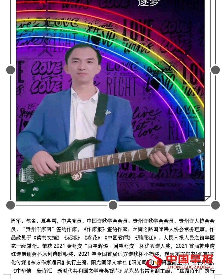 周军,笔名,夏冉雪,中共党员,中国诗歌学会会员,贵州诗歌学会会员,贵州诗人协会会员,“贵州作家网”签约作家。《作家报》签约作家;丝绸之路国际诗人协会常务理事。作品散见于《读书文摘》《花溪》《参花》《中国教师》《鸭绿江》,人民日报人民之窗等国家一级媒介。荣获2021金延安“百年辉煌·回望延安”杯优秀诗人奖,2021首届乾坤湾红诗朗诵会杯原创诗歌银奖,2021年全国首届远方诗歌杯小荷奖。现为东方作家(北京)文化传媒【东方作家通讯】执行主编,阳光国际文学社【阳光周刋】编辑室副主任,社长助理,《中华情 新诗汇 新时代共和国文学精英智库》系烈丛书常务副主编,“丝路诗刊”执行主编等职。
