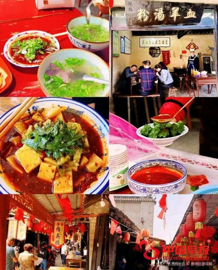 灰色的砖墙、墨染的黛瓦、火红的旗幌、青砖铺地的长长的民俗街,几百家小商铺飘出诱人的豆腐脑、羊血粉汤、关中烩菜、炸油糕、臊子面、油泼辣子的香味儿,香了一街,飘满山塬。