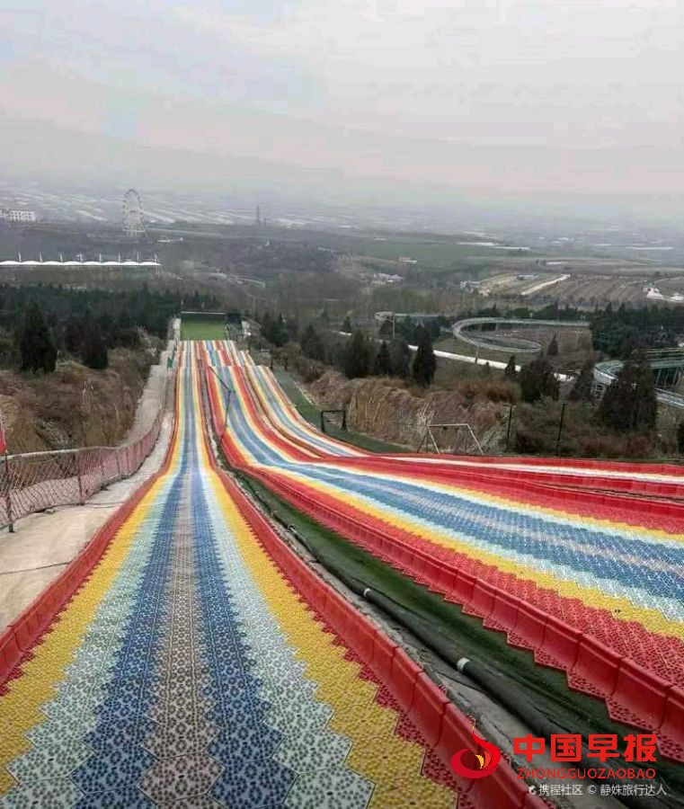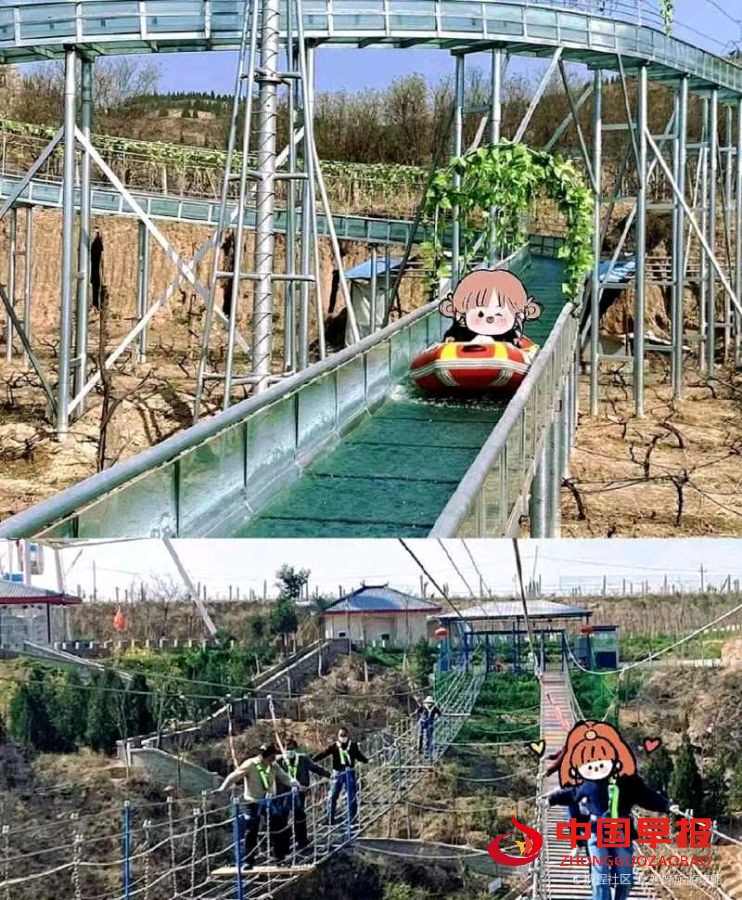 那七彩虹般从山顶直下的滑草坡,吸引了成群的少男少女,他们嘻嘻哈哈,牵着手从坡顶飞驰而下,享受着放飞的快乐。还有那些坦克、大炮等军事设施,满足着青少年的英雄梦,在鸟语花香里,体验一回没有硝烟的战斗。