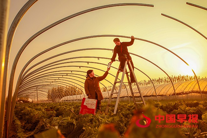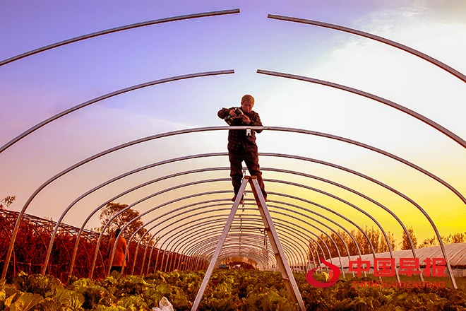 中国早报 河南讯(特约记者 李新义)11月20日傍晚,河南省开封市尉氏县庄头马头岗的村民正在蔬菜大田建造拱棚,给蔬菜防寒保暖。