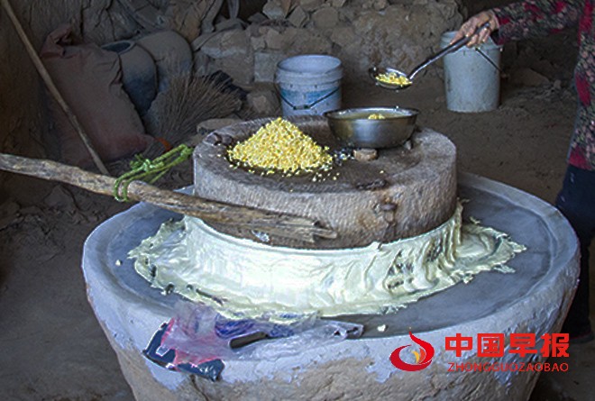 中国早报 山西乡宁(记者 赵玉虎)【做豆腐】要提前把挑拣好洗干净的黄豆泡软,再用磨豆腐的专用硙子磨成豆酱。然后将豆浆装在沙布袋里,放在锅上的箅子上揉,使沙布袋里的豆酱汁从布袋里浸出来。等锅里的豆浆烧开后点上卤水,这时锅里就飘起了絮状物。再把这些絮状的东西舀到铺着纱布的竹筛里,用纱布包好,整理并压制成型,这样豆腐就算做成了。做成的豆腐分成小块等凉透了放到冷水里,再放到闲窑里一直能放到正月十几不变质。不住人不生火的土窑洞就是一个天然的大冰柜,所以人们才敢在年前准备那么多吃的东西,不担心没处存放。