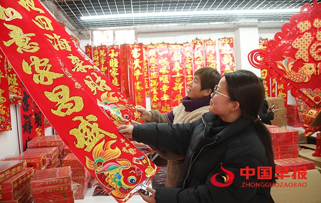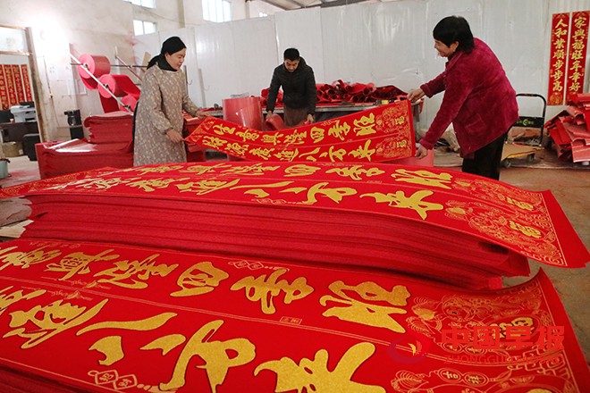 新年临近,眼下正是春节对联、“福”字等喜气用品的产销高峰期,尉氏县大桥乡大槐树壮丽工艺品作坊喜庆用品生产车间各条流水线开足马力,加班加点满负荷生产,把产品供应到国内外市场。