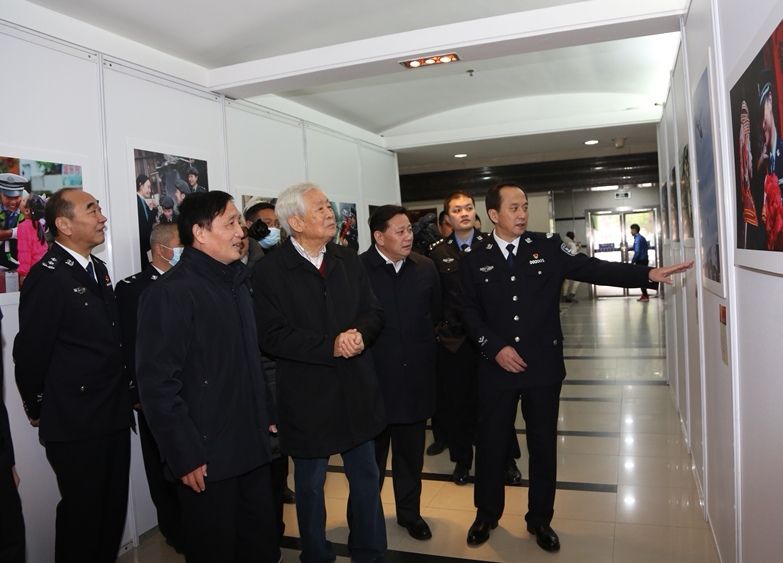 许显辉副省长等领导在参观湖南公安摄影展中胡立强拍摄的历史新闻照。