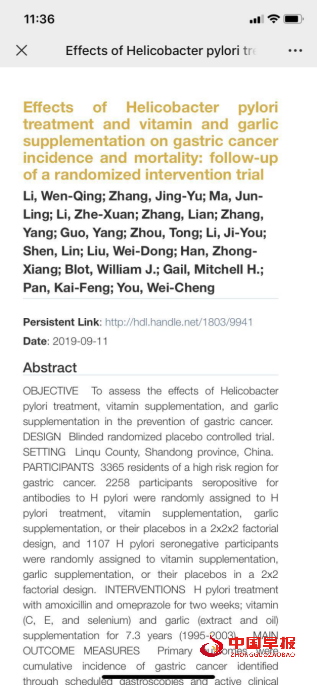 北大肿瘤医院的游伟程教授是“山东干预研究”这篇论文的主要作者,他是对临朐县胃癌长期研究的核心人物之一,名字出现在大量相关论文和论文索引中。在1995年开始的这项研究展开7年后,其研究成果便得到了国际学术界广泛认可。