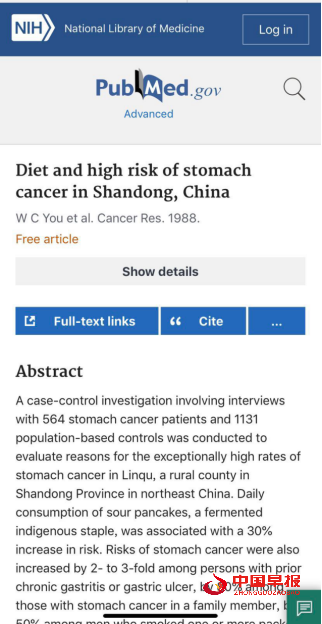 2.该研究主要在山东中部的一个县临朐进行。该县因胃癌发病率高,在医学界“相当有名”,30多年来积累了大量的科研成果。根据调查,临朐当地人,以前因为经济条件限制,主要吃的是酸煎饼。