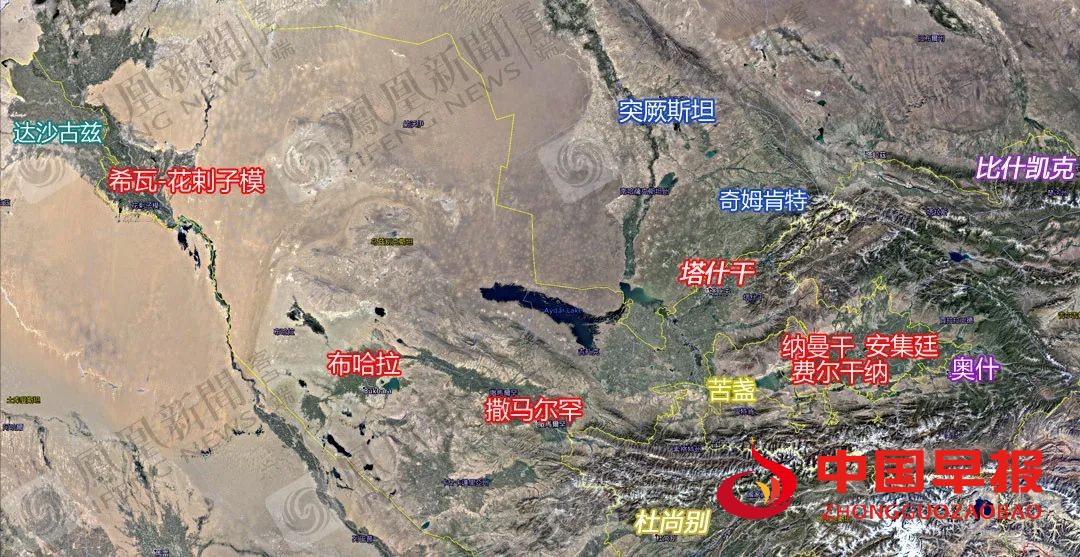 占有了费尔干纳最富饶的盆地核心区域,周围山区归吉塔国,占有了河中地区的撒马尔罕和布哈拉绿洲,占有了花剌子模的绿洲希瓦。