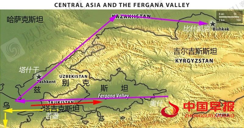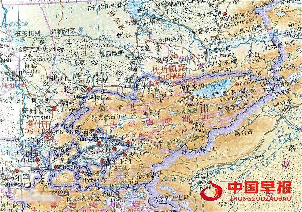 吉尔 的奥什和北边的首府比什凯克之间,更是需要借道乌兹、哈萨,绕道上千公里(上图紫线)。