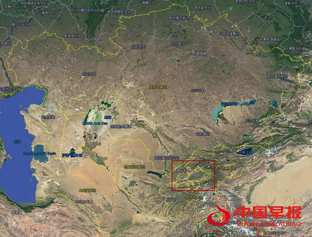 | 中亚卫星图,大部分为干旱地区,只有费尔干纳盆地(红框内)、七河绿洲、花剌子模绿洲、南哈草原,以及中国新疆的伊犁河谷等少数地区,降水量较大且平坦,适合农耕,也就成为多民族争夺的目标。