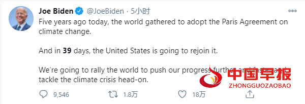 拜登发推表示:“五年前的今天,世界各国通过了关于气候变化的《巴黎协定》。39天后,美国将重新加入。我们将团结全世界,推动更大更快的进展,直面应对气候危机。”