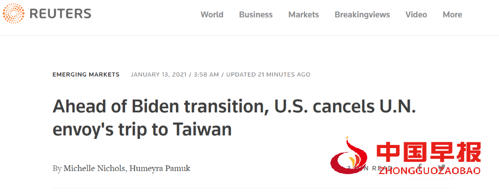 路透社说,克拉夫特的台湾行似乎是特朗普政府在拜登就职前对中国采取强硬态度的又一努力。中方曾表示坚决反对此次访问。