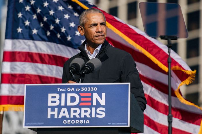 Former US president Barack Obama addresses voters one day before the election in Atlanta, Georgia, US, November 2, 2020. Picture taken November 2, 2020. REUTERS/Brandon Bell
