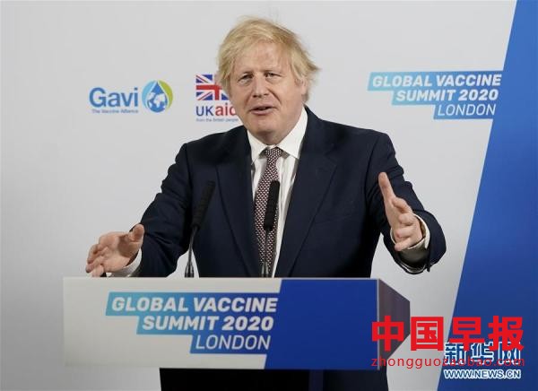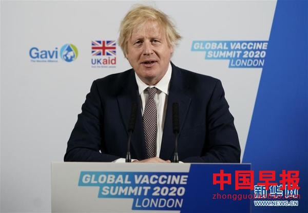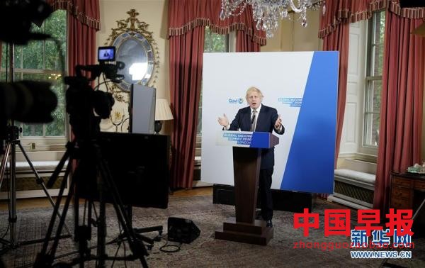 6月4日,在英国伦敦首相府,英国首相鲍里斯·约翰逊参加全球疫苗峰会视频会议并讲话。 新华社发(英国首相府供图)