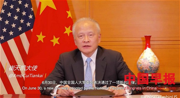 7月3日,中国驻美国大使崔天凯就香港国安法审议通过发表视频谈话。 图片来源:中国驻美国大使馆网站