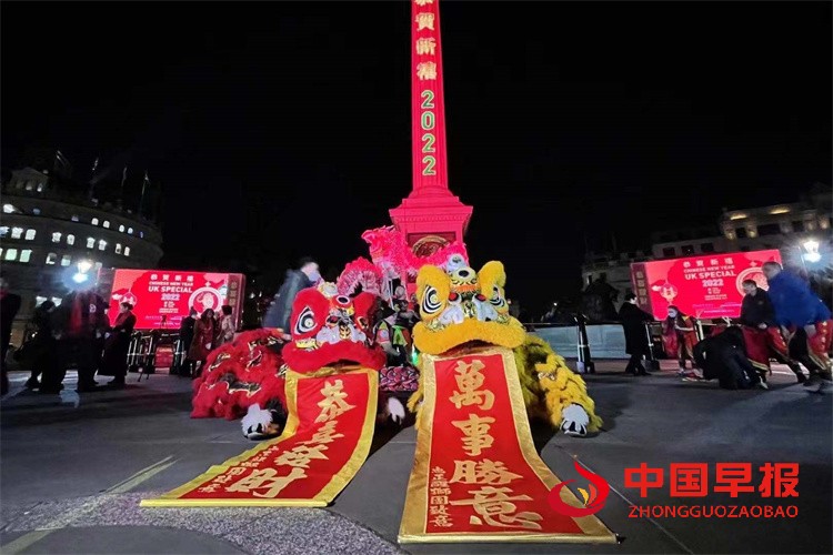 整个广场流光溢彩,年味十足。红色的灯光里,广场上纳尔逊纪念柱的柱身出现“恭贺新禧2022”中文字样,栩栩如生的金虎造型尤为引人注目。两侧大屏播放着虎年春节特别节目,让更多本地人在伦敦市中心零距离和中国年接触。