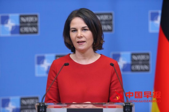 2021年12月9日,在比利时布鲁塞尔北约总部,德国外长贝尔伯克出席记者会。(新华社记者郑焕松摄)