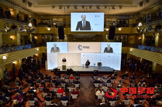 2月19日,在德国慕尼黑,德国总理朔尔茨在第58届慕尼黑安全会议上发言。(新华社记者逯阳摄)