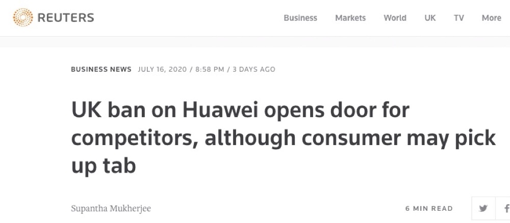 路透社16日报道称,对于英国电信行业来说,移除华为设备产生的成本将超过20亿英镑。替换华为设备产生的成本,最终可能会让消费者埋单。