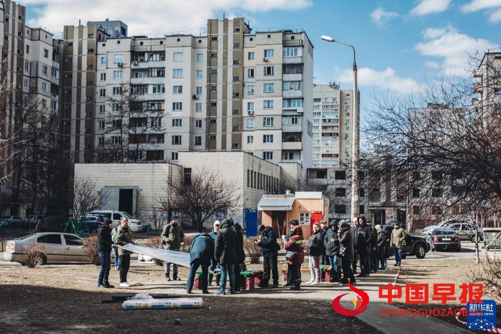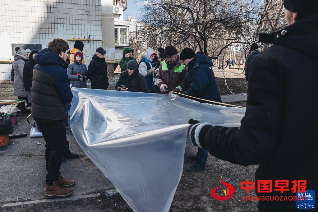 3月17日,人们在乌克兰基辅领取用来遮挡窗户的塑料布。