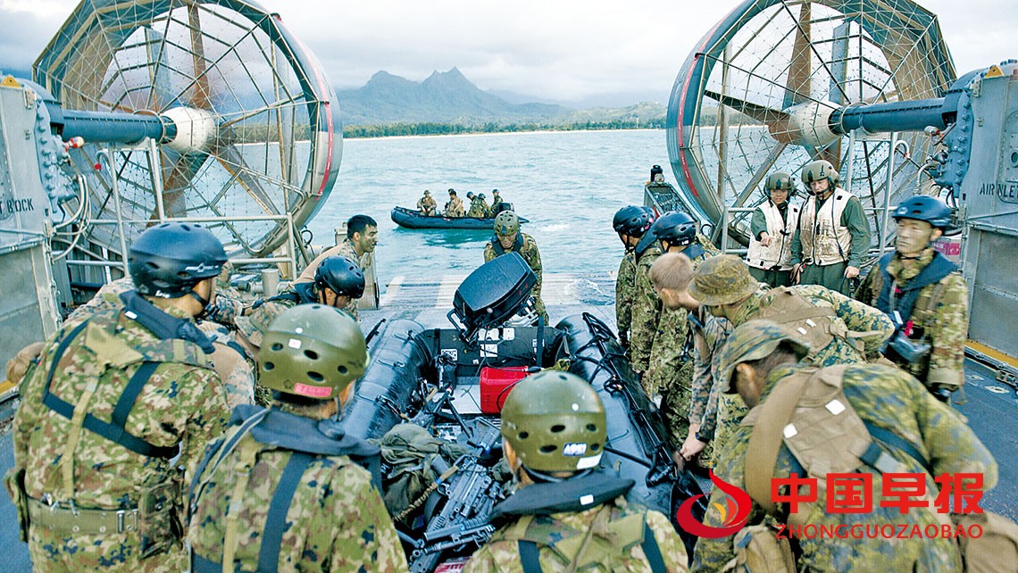 在“环太平洋”演习中,日本、加拿大和美国参演人员搬运一艘战斗橡皮突击艇入海(资料图)。