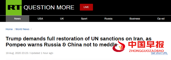 (RT:特朗普要求恢复对伊朗所有联合国制裁,蓬佩奥警告中国不要干涉)